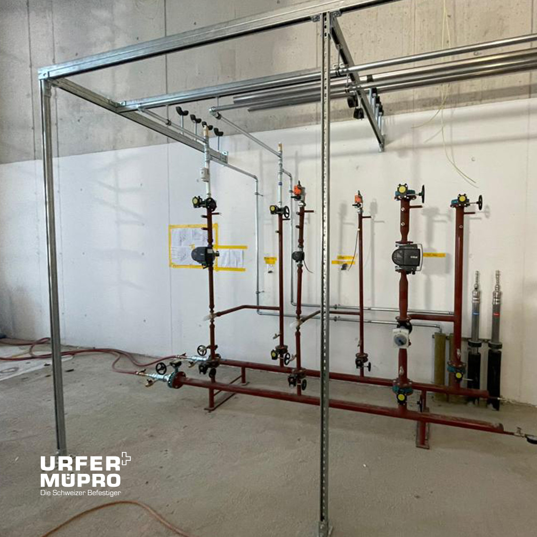 Kunde: Bouygues, Zürich Objekt: Novolog Fedex MPR Schienenrahmen für Heizungs- und Kälteverteiler im Obergeschoss der Halle, montiert am Boden. Spezielle Situation, da Deckenhöhe keine Befestigung Boden/Decke zulässt.