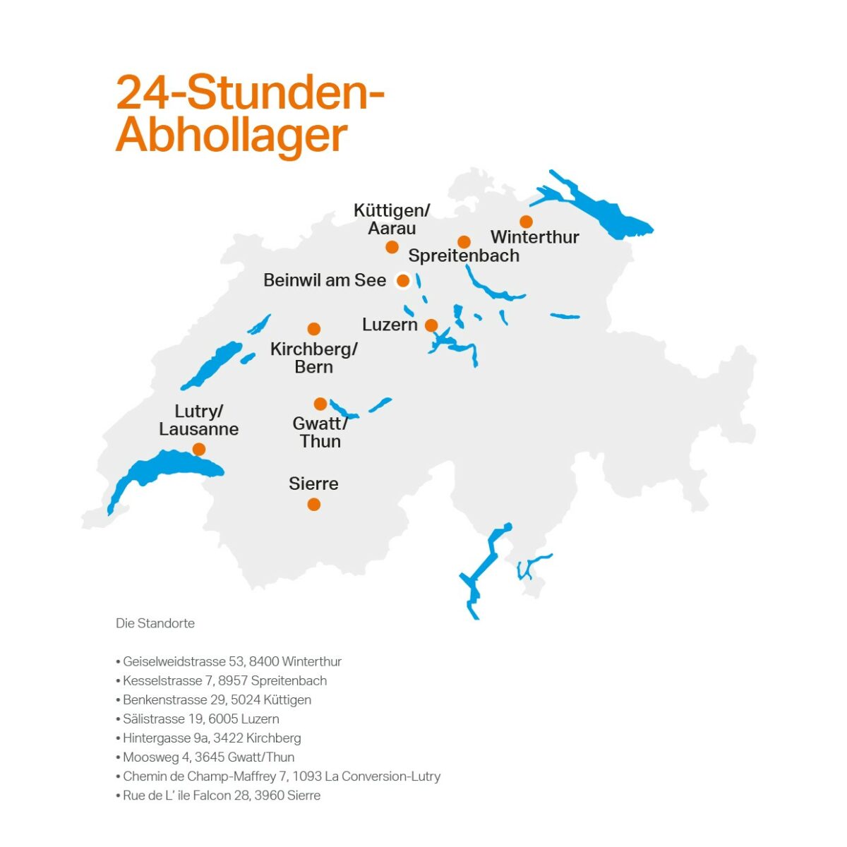 In unseren 24-Stunden-Abhollager können sich unsere Kunden rund um die Uhr selbst bedienen. Mittels Code erhalten sie Zugang in das jeweilige Lager. Unsere Aussendienstmitarbeiter sind für deren Bewirtschaftung zuständig. Mehr dazu: https://develop.muepro.ch/services/#24-stunden-abhollager