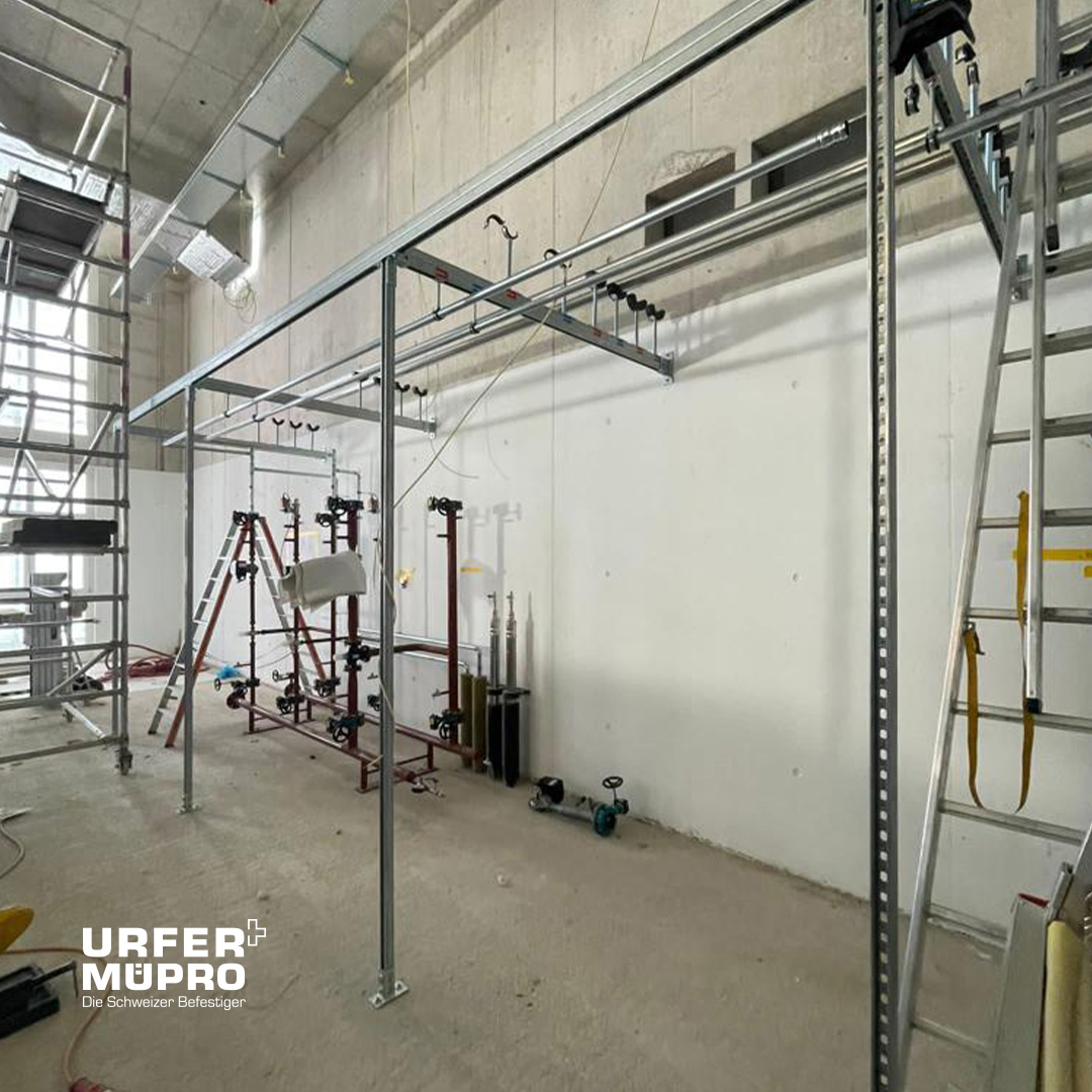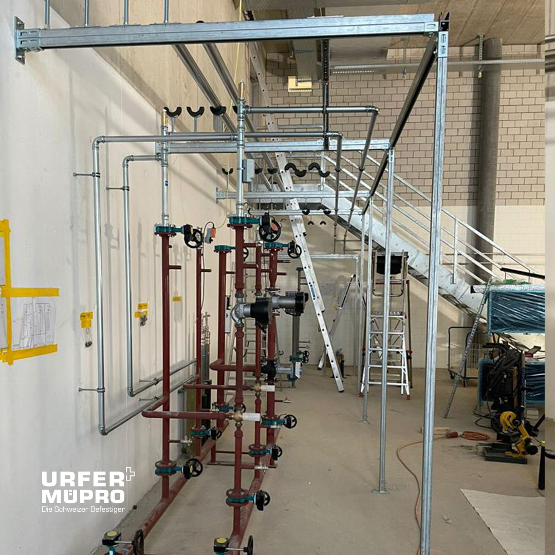 MPR Schienenrahmen für Heizungs- und Kälteverteiler im Obergeschoss der Halle, montiert am Boden. Spezielle Situation, da Deckenhöhe keine Befestigung Boden/Decke zulässt.