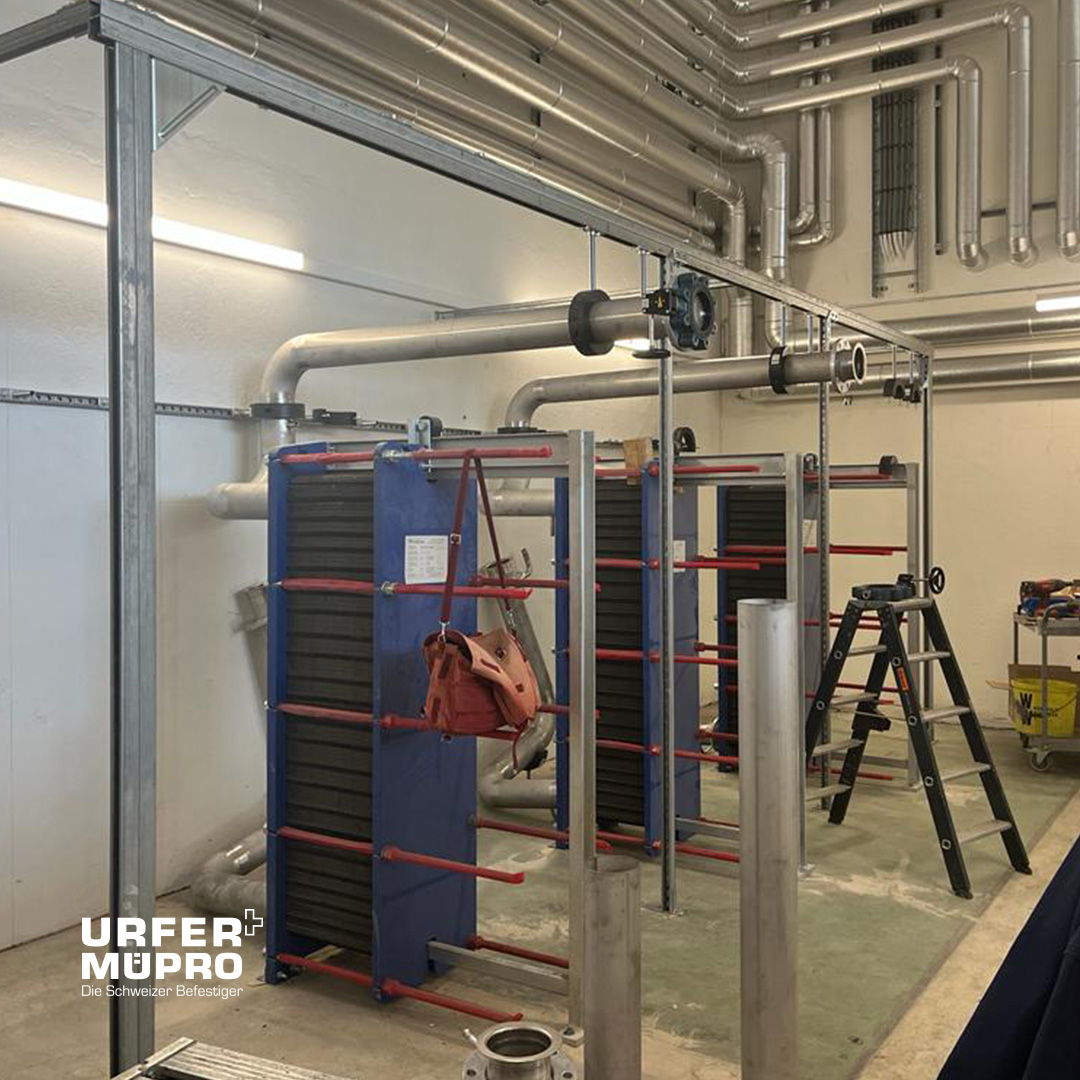 Rahmenbau aus Müpro-Profilen für die Befestigungspunkte des Verteilers und dessen Komponenten. Spezielle Situation, da Verteiler vor einem Fenster montiert werden musste.