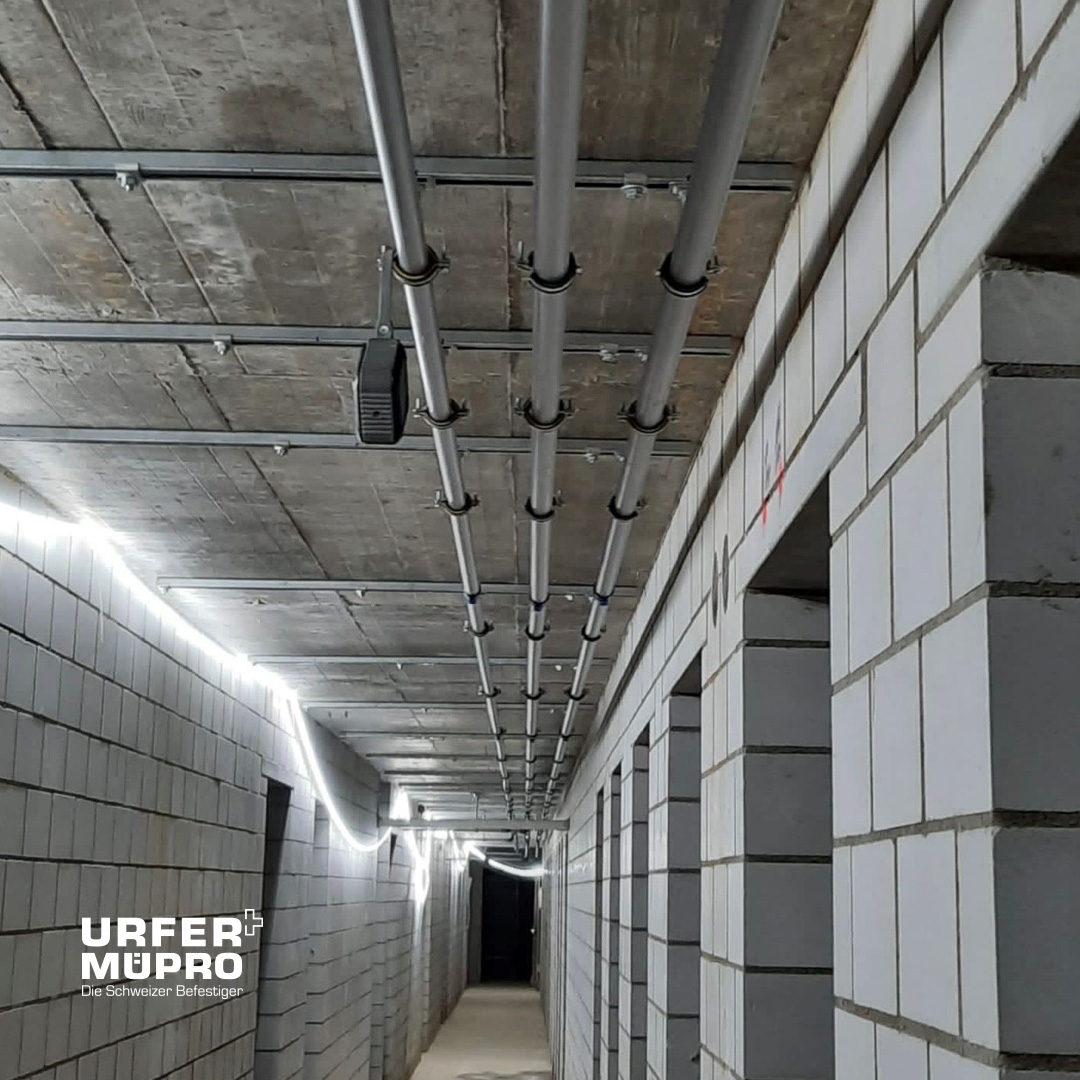 Montage Schienentrassen durch Sanitär. Gleichzeitig wurden Rohrschellen für die Heizungsrohre mit montiert.