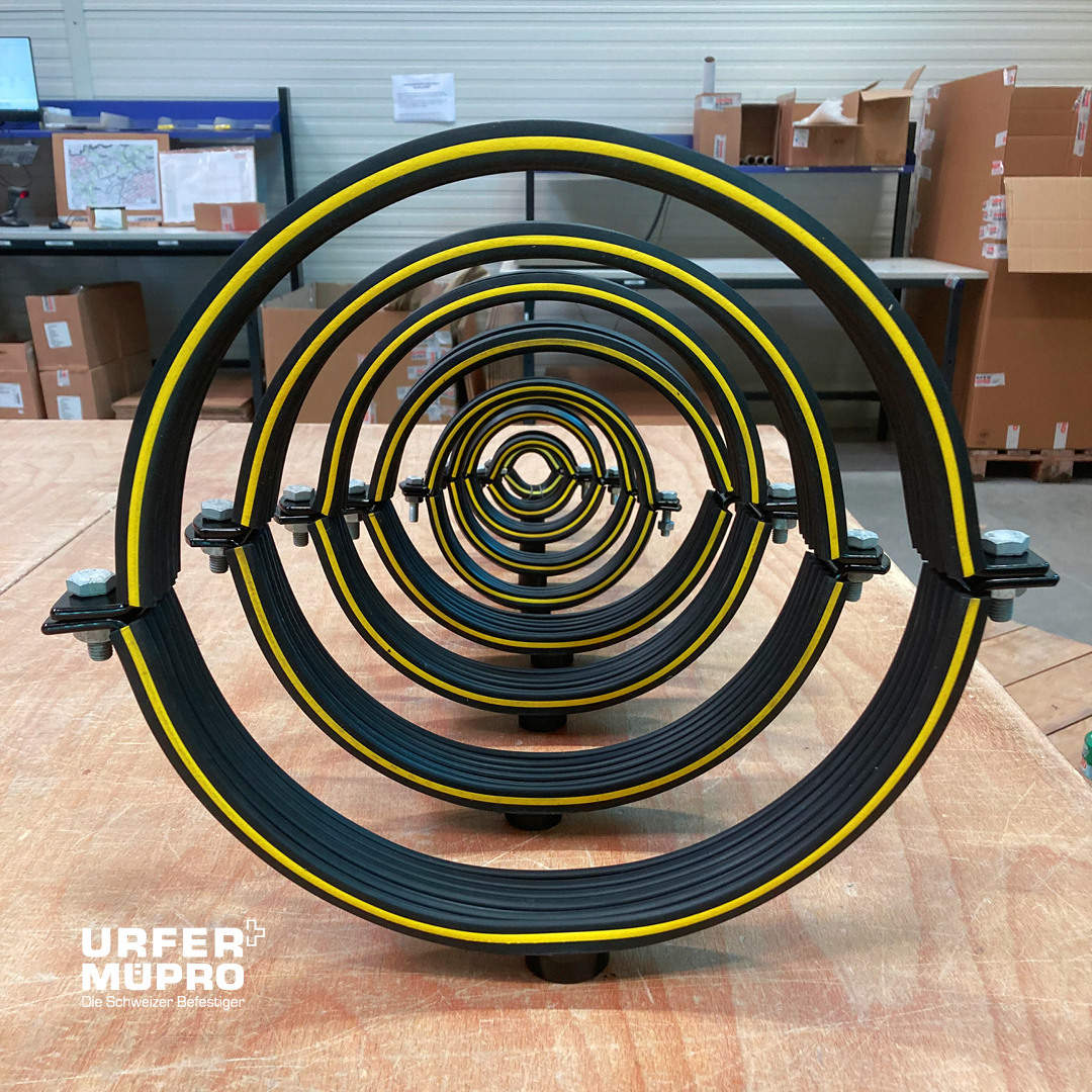 Unsere Rohrschellen, Gewindestangen und Grundplatten werden nicht nur präzise nach Kunden-Anforderungen gefertigt, sondern auch mit einer erstklassigen Duplex-Beschichtung geliefert. Hier sehen Sie sie in der Farbe RAL 9005, tiefschwarz.