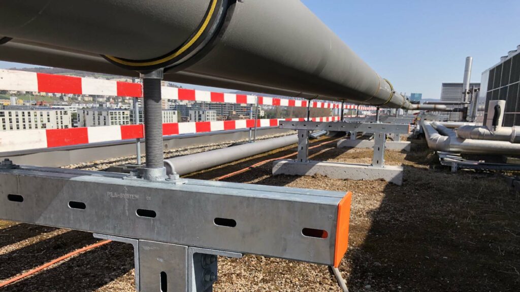 Die Verbindungsleitungen bei diesen Anlagen sind meistens grössere Dimensionen ab DN100-DN300. Diese werden mit schweren URFER-MÜPRO AG MPT-Tragprofilen/Tragkonstruktionen montiert. Da die Installationen im Aussenbereich sind, werden alle Befestigungsmaterialien feuerverzinkt oder in Chromstahl installiert.